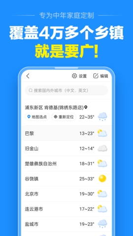 支持国内4万多个乡镇,全球20多万城市的天气预报,精准预报您身边的天气,检测覆盖,就是要广