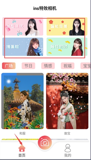 1、下载安装该应用,打开软件,在首页有“发型测试”,“智能变美”,“漫画脸”等功能;