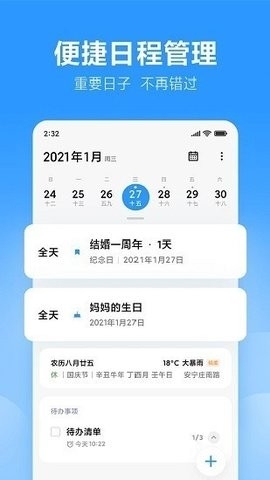 小米日历APP是由北京小米移动软件有限公司打造的一款手机日历查询软件,界面是非常清爽整洁的,能够查看各种日历、农历以及宜忌事项,用户还可以设置待办事项,日程提醒等功能。还可以使用该软件来查看天气信息,输入地点名称即可,满足众多用户的各种使用需求,有需要的用户快来下载体验吧!