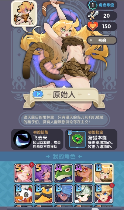 第四个推荐的是原始人,他的级别虽然处于B级,但是他的技能飞去来真的很好用,让出回旋镖,可以快速攻击敌人的同时并反向移动。后期可以把此技能放大,可以看到周边的敌人被飞镖攻击的片甲不留,他通过秘宝可以提升自身的暴击率和攻击力。