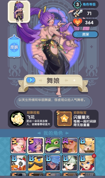 第二个推荐的S级英雄是舞娘,他可以在每日登录的奖励中领取,初始技能是飞花,随着不断的移动不断变大,能力非常强,可以让敌人产生减速的同时达到攻击效果,只要敌人在花的范围内,都会受到一定伤害。另外在场景挑战中,会每隔一段时间,出现星星加速技能,为角色带来无敌状态,关键时刻可以快速逃离敌人攻击范围。