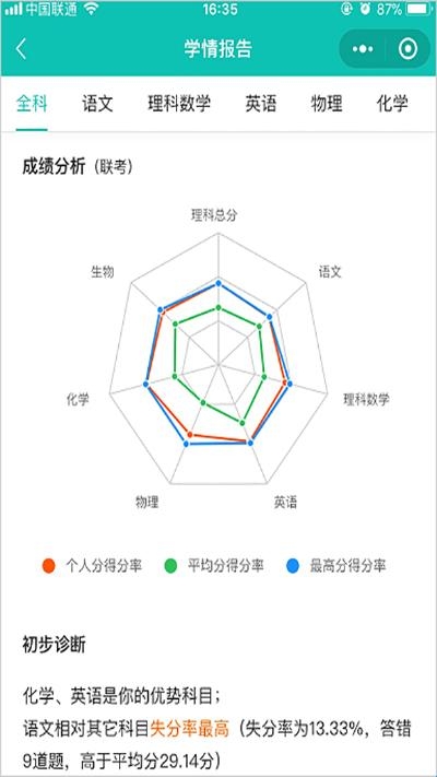 直观的显示出个人的得分率与整体的对比情况,并根据个人的成绩初步诊断学生的各科情况: