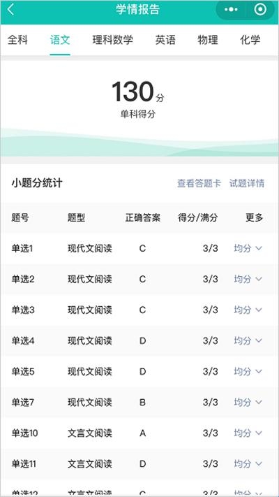 各科各题的得分情况,点击均分可查看该题的班级、年级、联考的均分对比情况,点击查看答题卡可查看本人的答题卡图片情况。