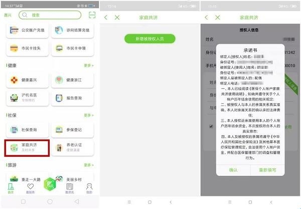 3、开通电子社保卡后,需要您返回“首页”,在“首页”中“社保模块”下点击“家庭共济”图标,然后点击“新增授权人员”,仔细阅读授权协议了解相关注意事项,并核对界面上方绑定的授权人信息,然后在界面下方空格处输入正确的被授权人信息并据实选择两者关系,最后点击“提交申请”完成备案登记手续,后台审核通过即可完成办理