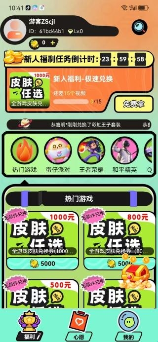 天天嗨皮app是一款是一款免费领取游戏皮肤软件。用户通过完成软件内提供的相关任务就可以免费获取热门游戏的皮肤,如和平精英,蛋仔派对,王者荣耀等。并且还有超多礼包和道具哦。用户可通过每日签到、幸运转盘抽奖及观看广告等方式积累积分或金币,直接兑换心仪皮肤!