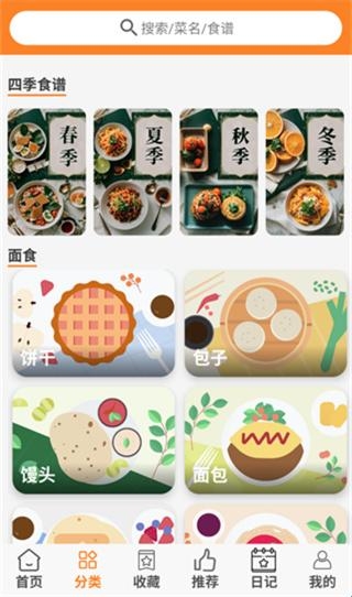 4、点击下方分类,可以按照不同类型和不同季节进行查找食谱。