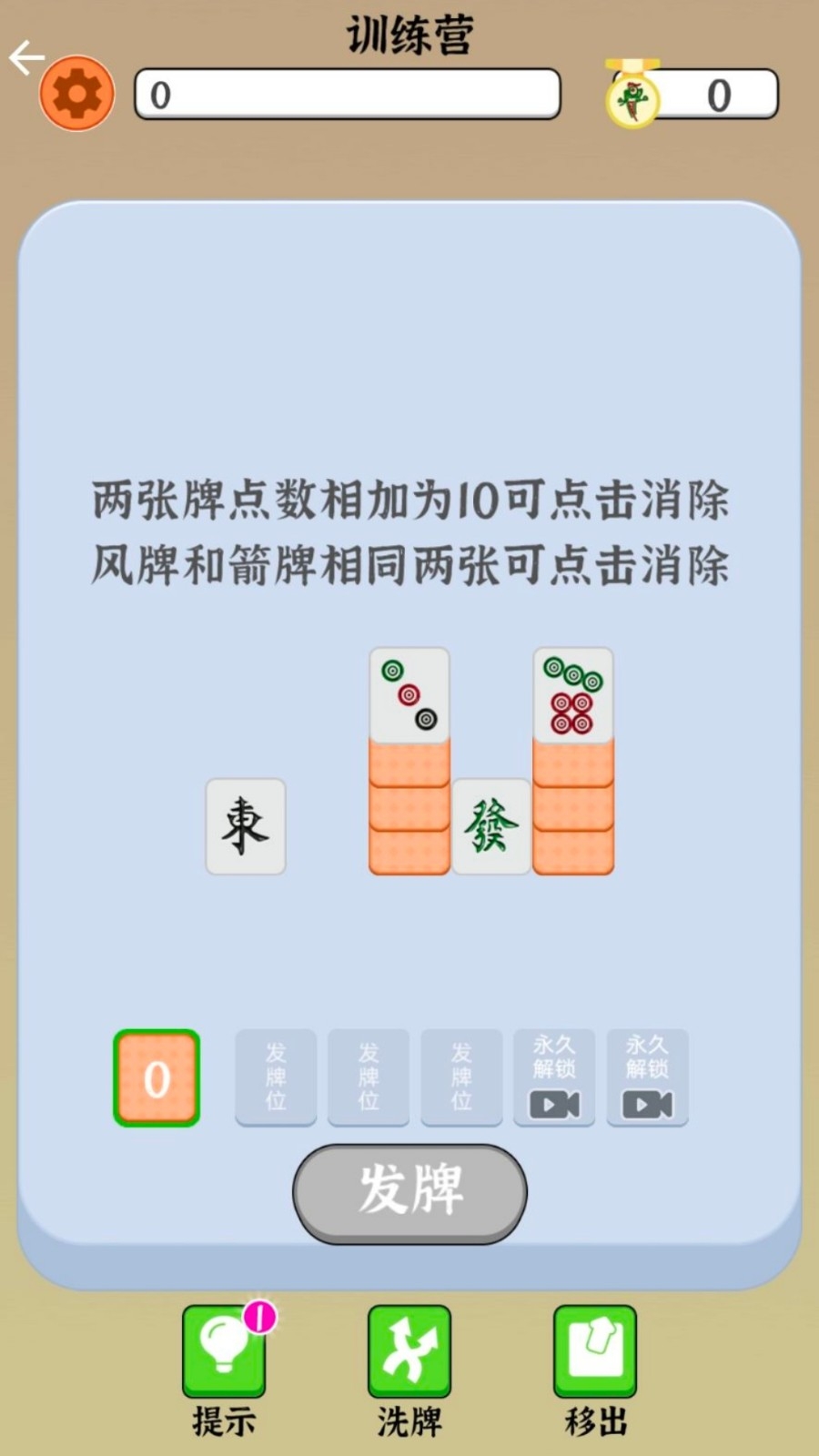 1、进入训练营,了解最基础的游戏规则,两张牌点数相加为10可点击消除,风牌和箭牌相同两张点击消除。