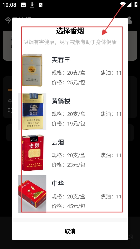 3、选择香烟页有【芙蓉王】【黄鹤楼】等品牌,选想用的香烟品牌,进行打卡。