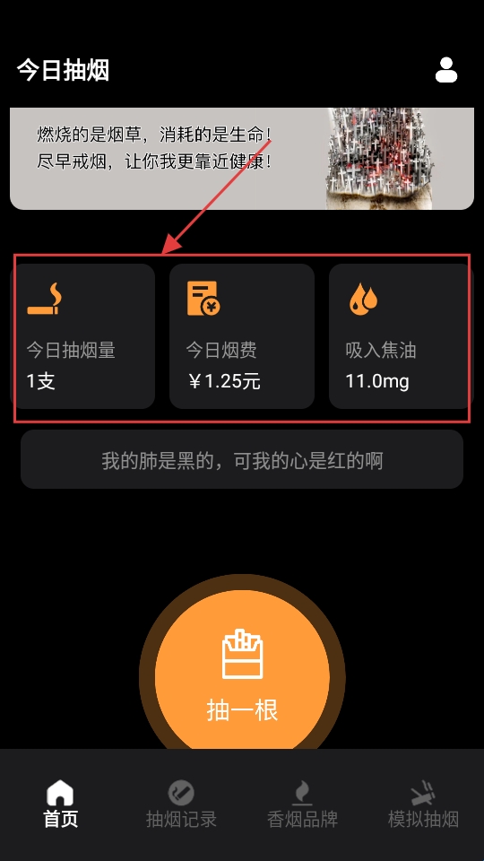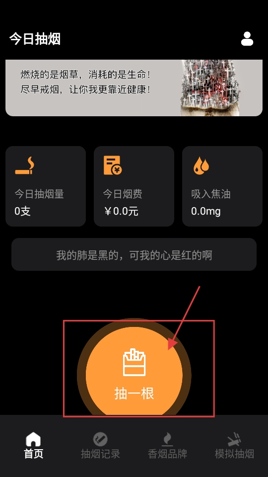 1、首页有【今日抽烟量】【今日烟费】等显示,想抽烟,点【抽一根】按钮。