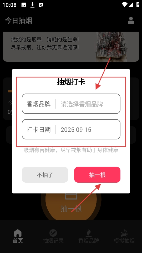2、抽烟打卡弹窗里,选好香烟品牌、确认打卡日期,点【抽一根】,完成打卡。