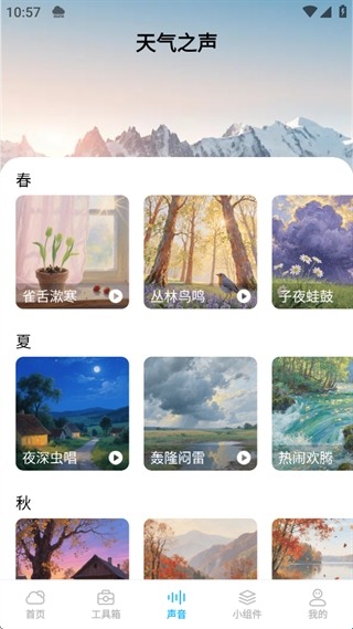 3、提供天气之声,聆听各个季节的自然之声,让你平心静气,舒缓身心;