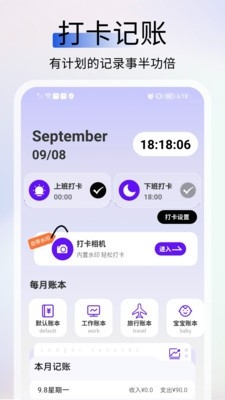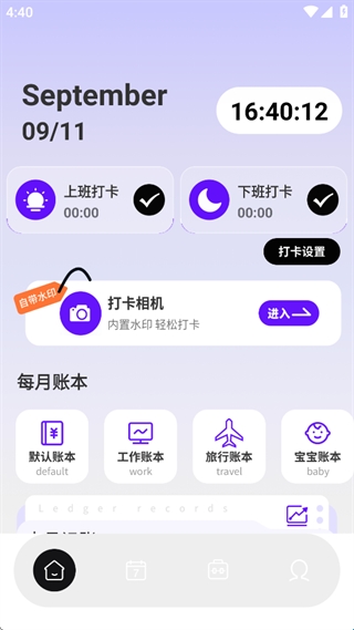1、打开app就能看到多种功能,上下班打卡,打卡相机,每月账本任你使用;