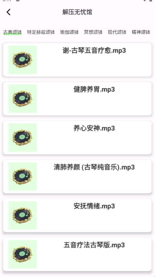 4、点击第一个进入,就能看到最新的音乐疗愈音频,点击进行播放,让您缓解压力。