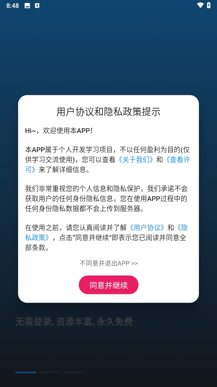 1、在本站进行软件的下载安装操作,我们打开之后便会看到相应的隐私协议界面,我们需要仔细阅读,如果没有任何问题的话点击同意并进入到下一步。