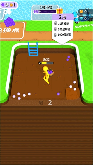 3、努力挖掘进行等级提升,这样可以提高我们的载货能力(载货能力越高,每次可以收集的小球就越多,就能兑换更多的金币,无需多次来回跑);