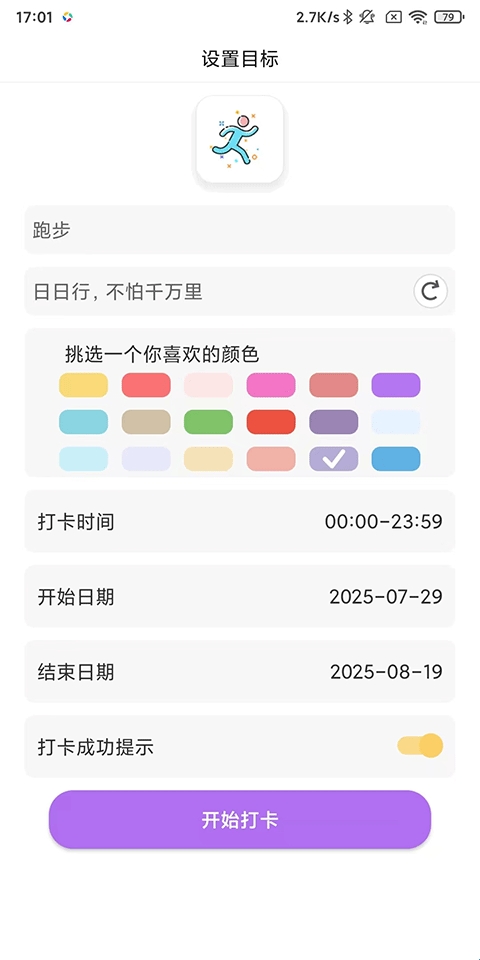 3、如以跑步为例,选择一个喜欢的颜色,设置打卡时间、开始日期、结束日期以及开启打卡成功提示,完成后点击开始打卡;