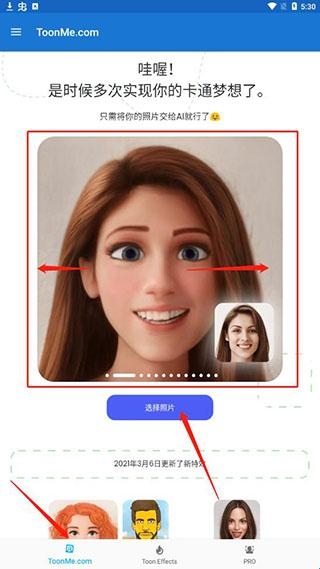2、使用ToonMe中文版的人工智能魔术可以自动重画卡通或矢量风格的肖像。