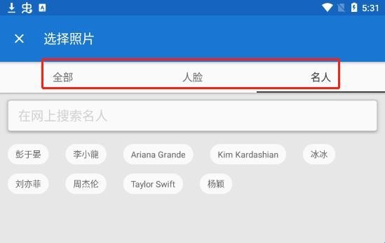 2、可以在全部中选择照片,也可以在自动识取的人脸中选择照片,还可以选择名人,比如明星;