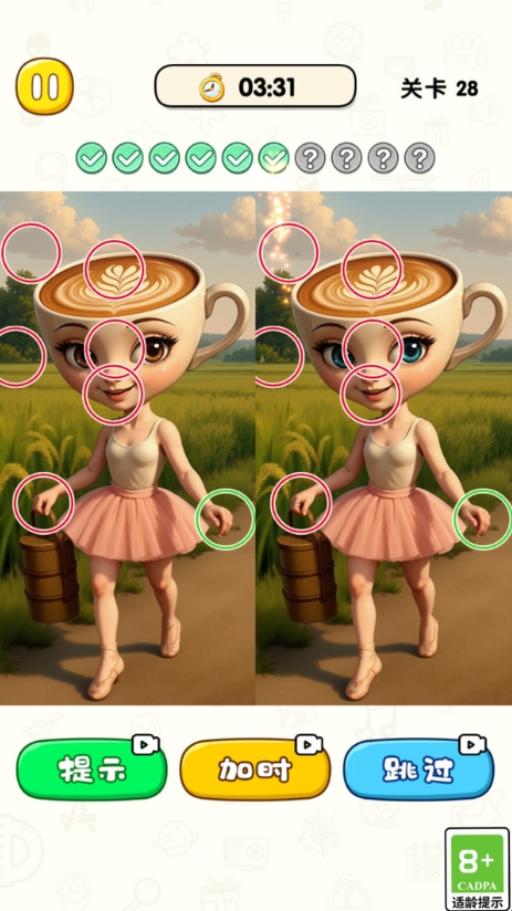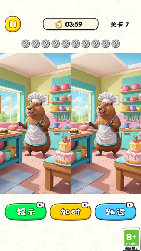 1、进入关卡后仔细观察左右两张相似图片,寻找所有差异之处;