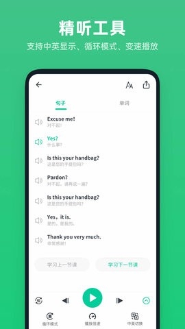 4、单句单篇精听,允许自定义播放语速、播放模式。