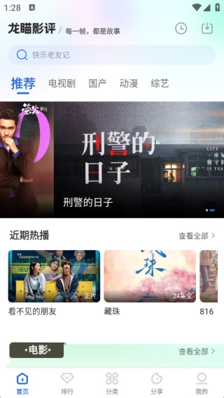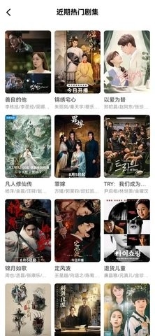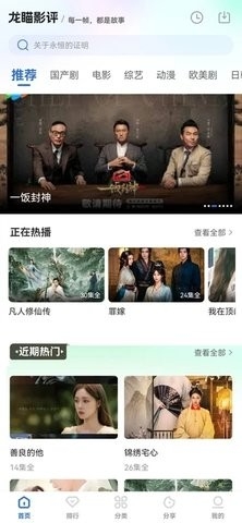 1、在首页提供了推荐的各类影视,还可以了解近期热播的各类影视,同时有电影、动漫等不同的分类;