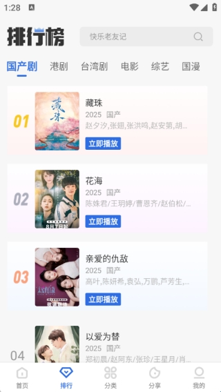 2、在排行页面中有国产剧、港剧、台湾剧、电影、综艺及国漫等不同的排行,及时和在晓各类排行信息;