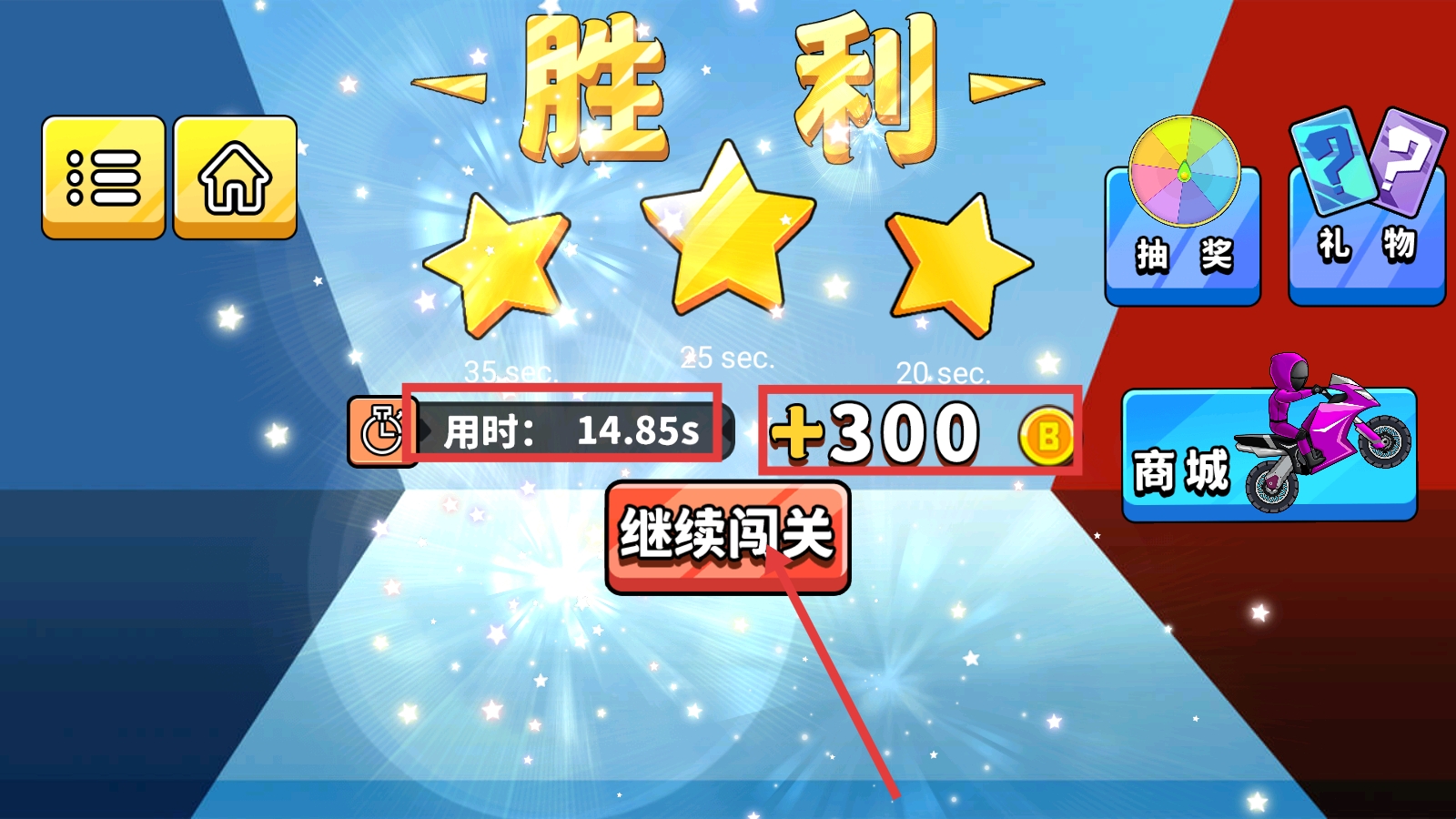 4、通关后可获得【+300-B】金币奖励,点击【继续闯关】按钮,挑战后续关卡积累更多资源。