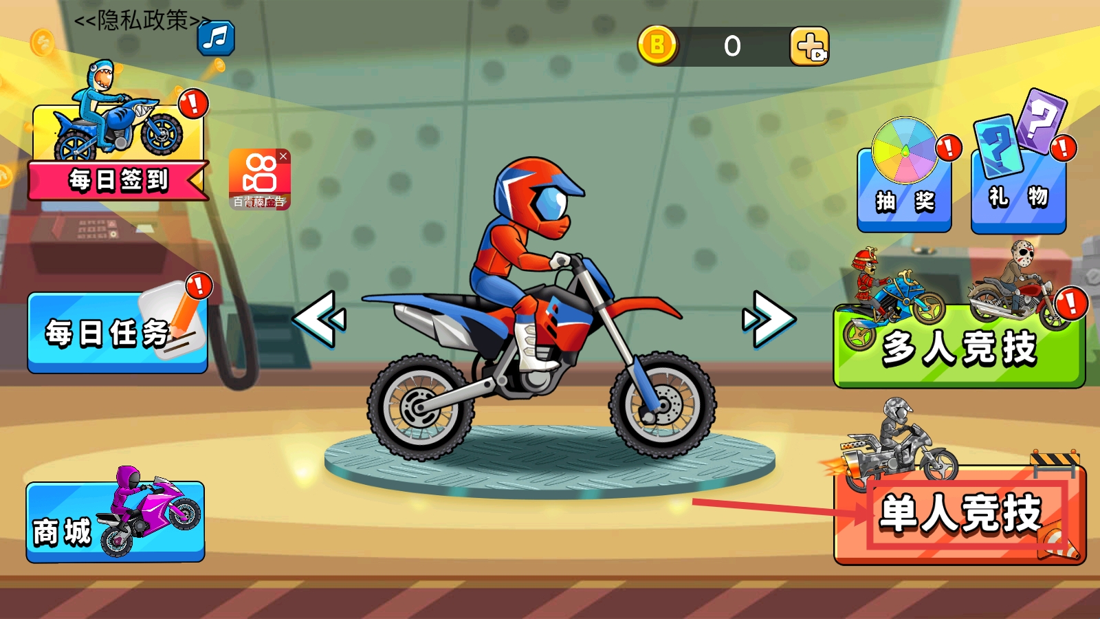 1、进入游戏后,点击【单人竞技】按钮,开启单人摩托竞技关卡,开启驾驶挑战。