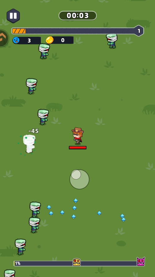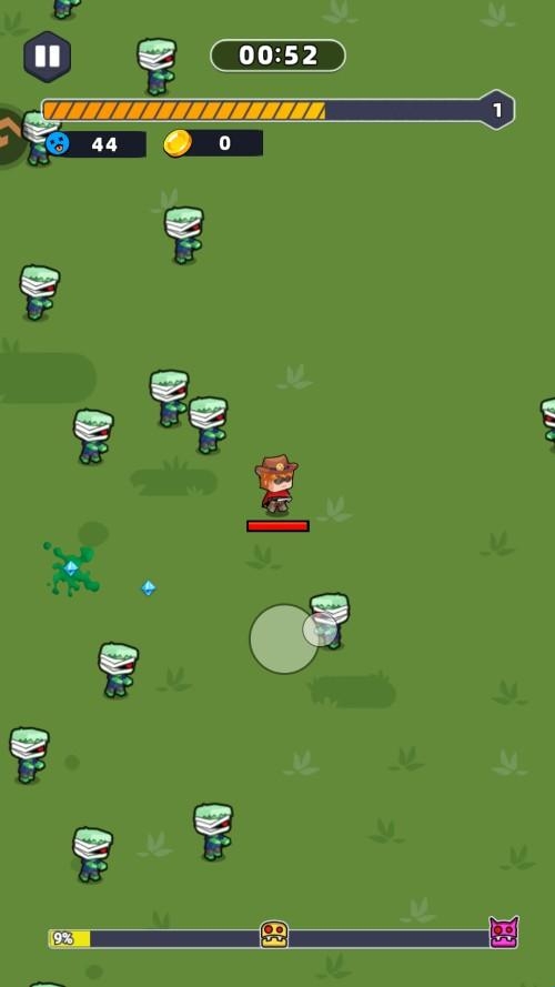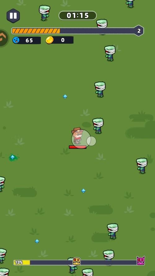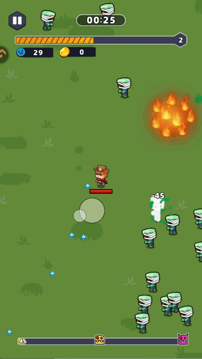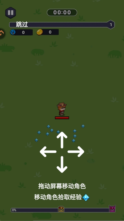 2、指尖移动控制角色进行移动,拾取经验,打败敌人。