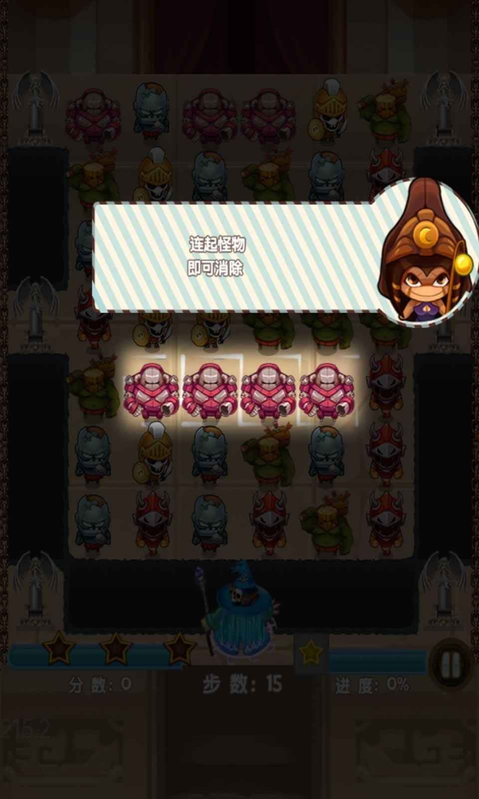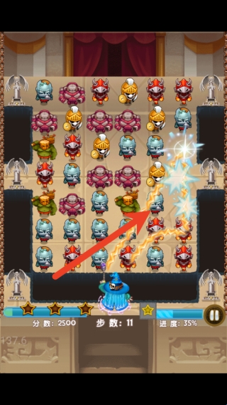 2、通过手指滑动交换相邻的图案,将三个或以上相同图案连成一线即可消除,每步操作都消耗有限的步数。