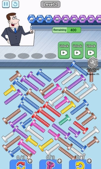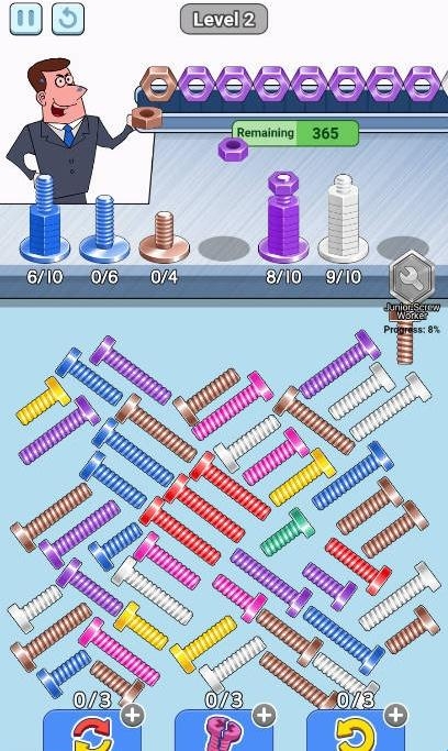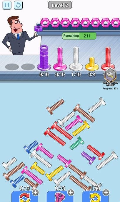 1、支持同时配对多个相同颜色的螺丝,考验玩家的观察力与快速反应能力。