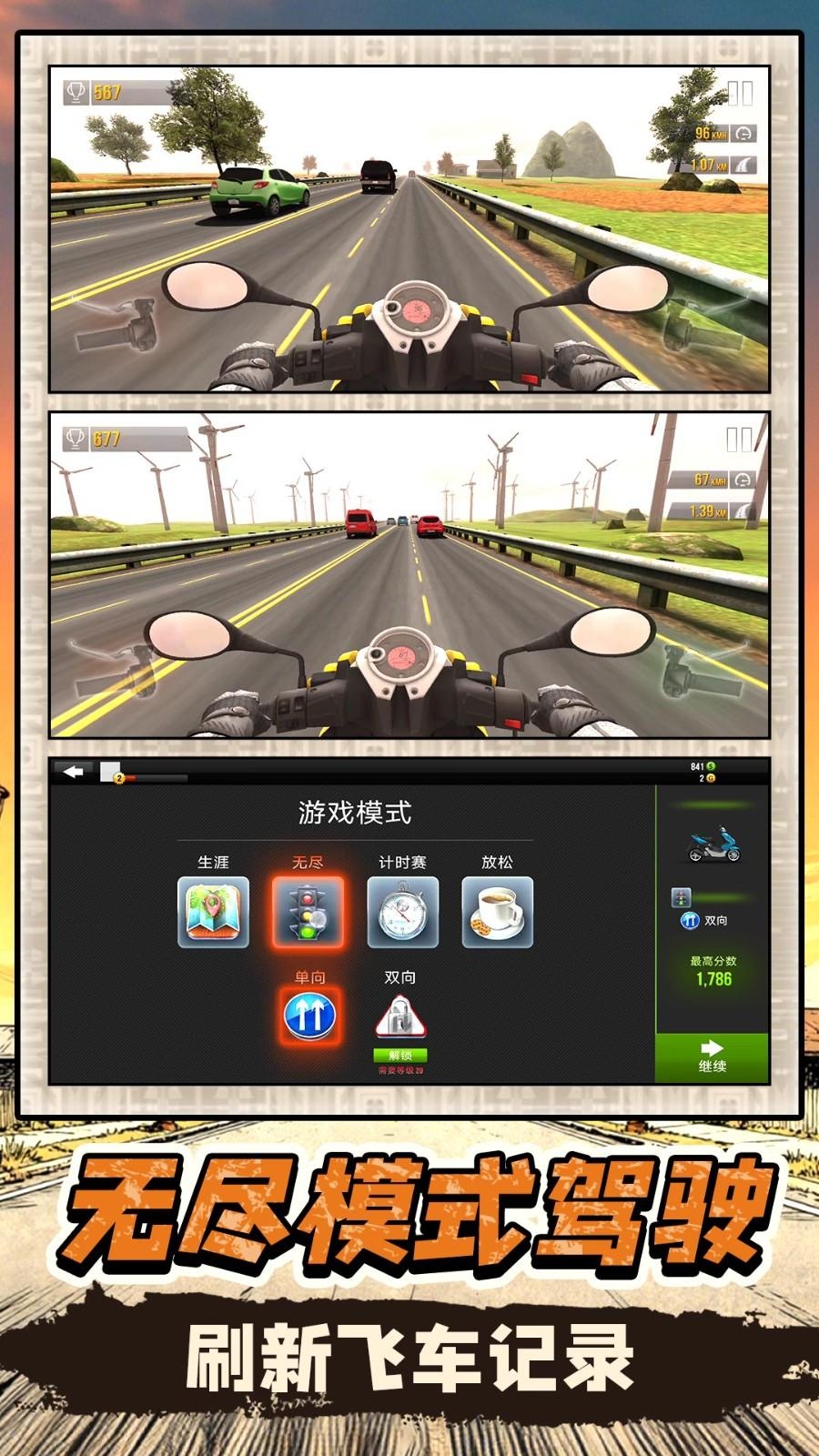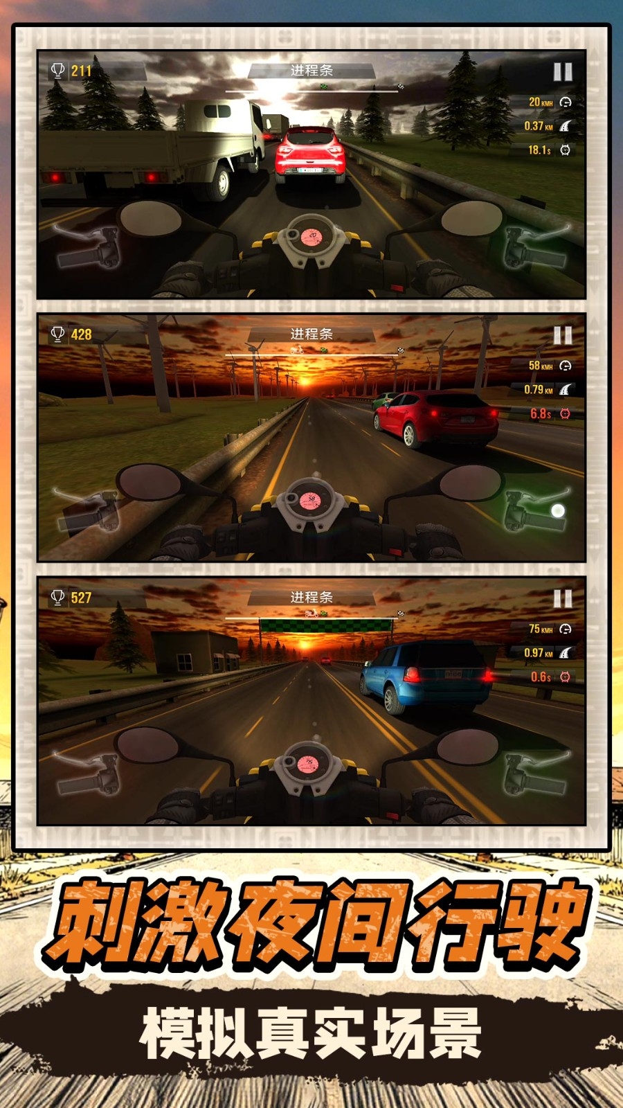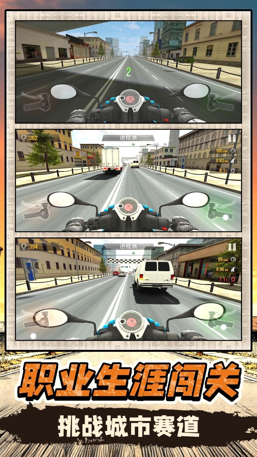 2、多种竞速模式都能自由选择,玩家需要在有限的时间内完成挑战,在各种道路上快速驾驶摩托车。