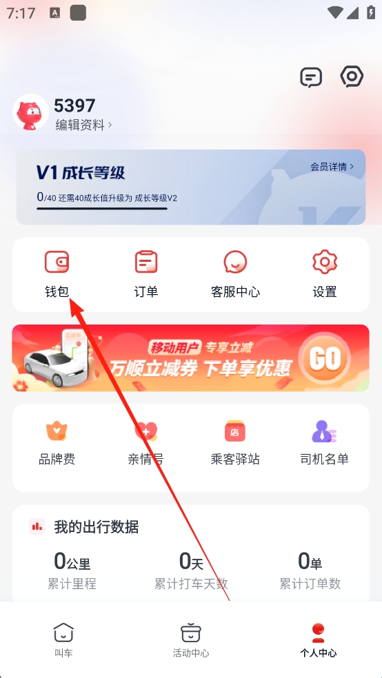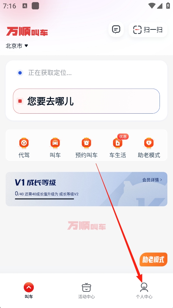 1、打开万顺叫车App,登录之后,点击【个人中心】