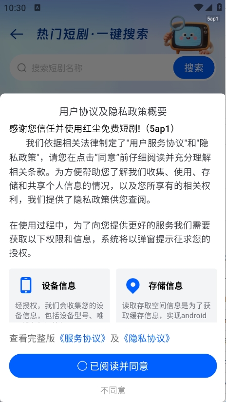 1、用户首先下载红尘免费短剧app,查看并同意隐私政策与用户协议。