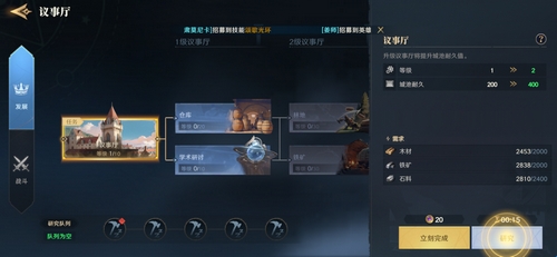 4、玩家在其中需要在议事厅之中将各种功能逐步进行升级,去解锁出更多的有用的东西。