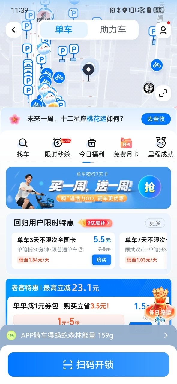4、点击骑行会显示周围所有单车位置,然后点击扫码即可解锁单车。