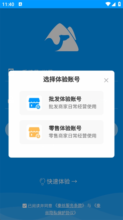 1、在本站下载好秦丝进销存,并输入手机号进行注册,也可以先点击下方的快速体验。