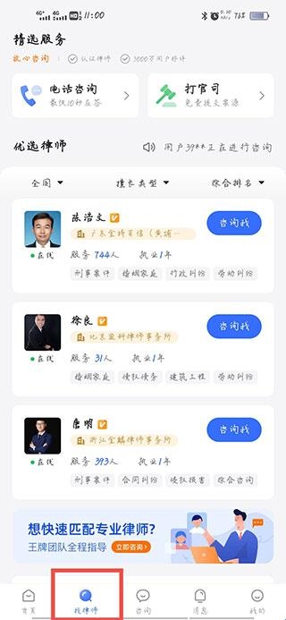 2、在首页选择找律师。