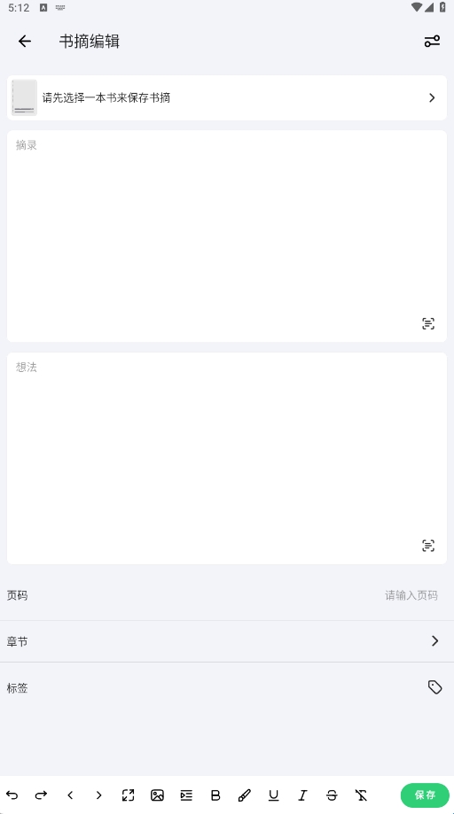 4、我们还可以在书摘编辑界面,创建自己的书摘,包括添加摘录内容、想法等等,编辑完成后选择保存就可以了。