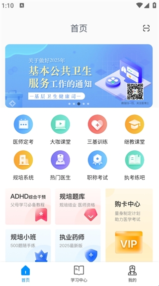 2、进入首页,有医师定考、大咖课堂、三基训练、继教课堂等等功能。