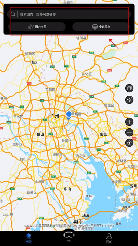 1、在本站下载好奥维3D地图并打开,用户需要根据自身需求在屏幕上方选择国内街景或者全球景点,或直接搜索框搜索。