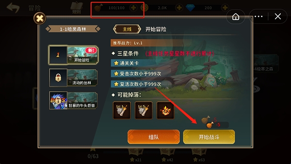 5、每个冒险关卡都需要消耗五点体力值,体力值上限为100。