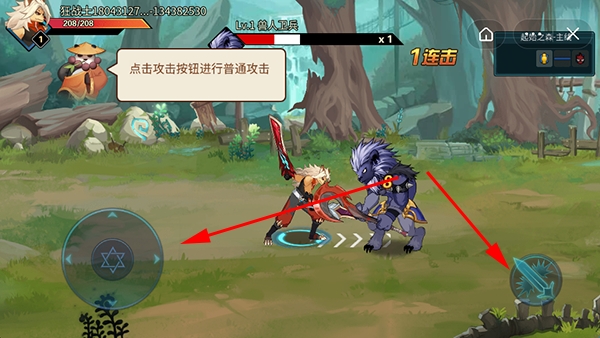 2、进入游戏内后我们通过左侧移动角色,右侧点击攻击按钮进行普通攻击。