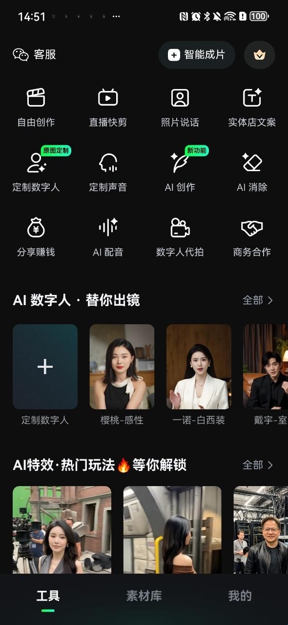 3、登陆后进入主页后有着多种功能如自由创作、直播快剪、定制数值人等多种功能供用户使用。