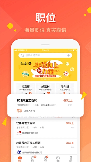 1、打开齐鲁人才招聘后,在首页选择我要找工作或我要招聘,求职者可浏览高薪岗位,招聘方可直接进入招聘通道。