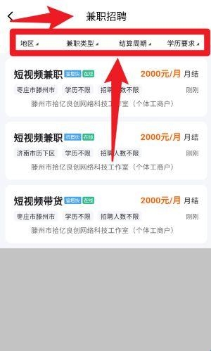 5、在兼职招聘页面,可通过筛选栏选择地区、兼职类型、结算周期及学历要求,从而精准找到符合条件的兼职岗位。