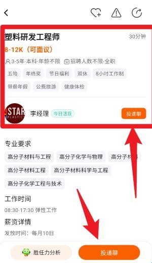 4、点击具体职位进入详情页,可查看岗位薪资、工作时间、专业要求等信息,并可通过“投递聊”按钮直接联系招聘方。