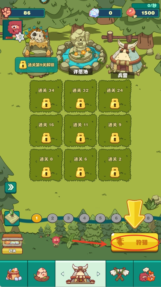 3、点击关卡1,就可以自动开始狩猎。