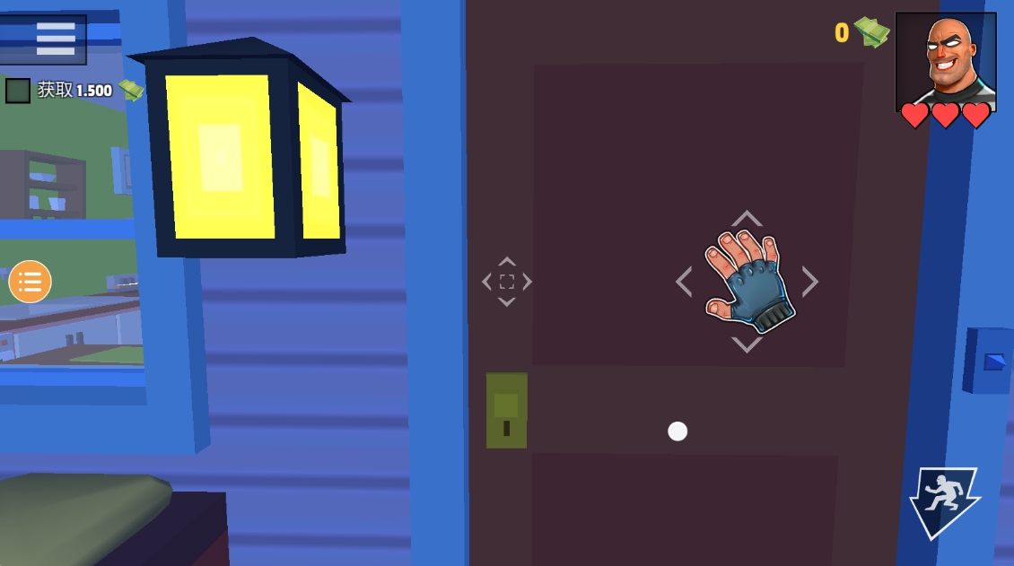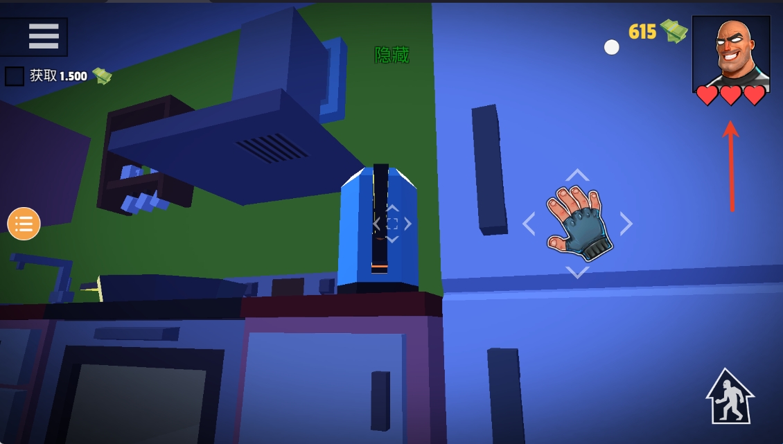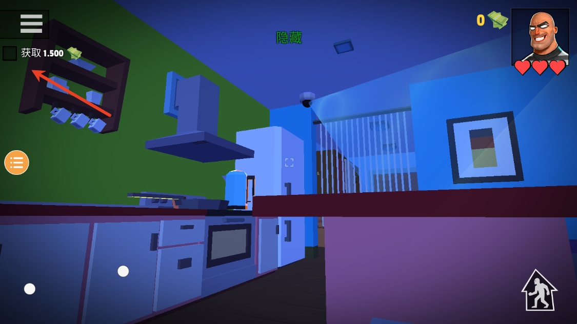 7、右上角有血量提示,记住千万别被发现哦,而且拿到的东西会直接兑换成钞票。