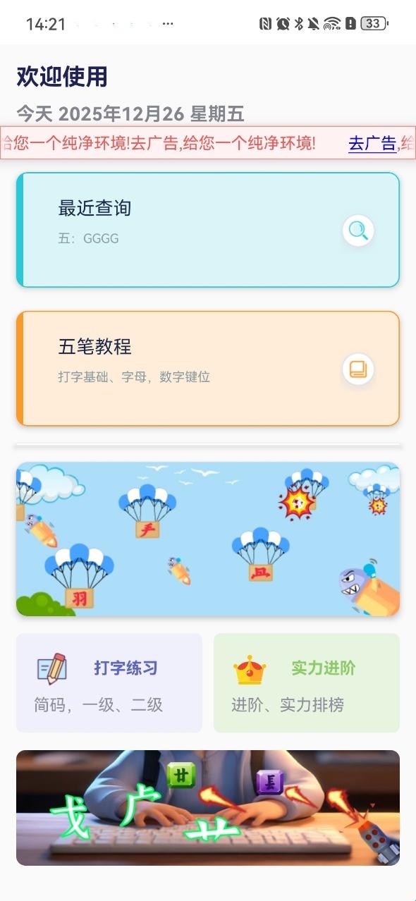 2、进入后在主页有着最近查询、五笔教程、打字练习、实力进阶等多种实用功能供用户选择。